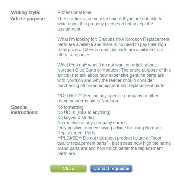 This particular example is pretty specific, but many of the orders don’t have any special instructions other than using a specific keyword. If you decide you would like to write this order, close the Special Instructions by clicking on the green Close button. Then, you can click on the green Write Article button.